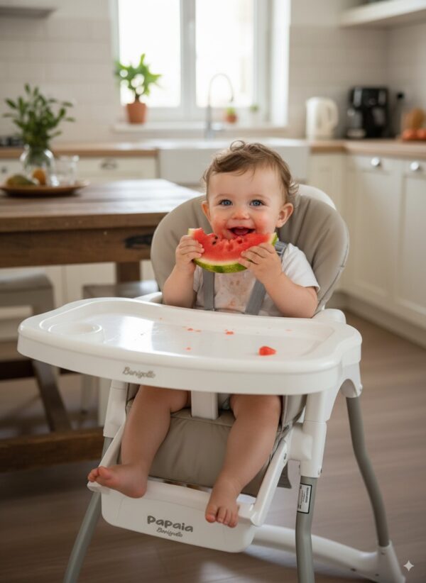 Cadeira de refeição Burigotto Papaia champagne, ate 23 kg A Cadeira de Refeição Burigotto Papaia até 23kg é garantia de praticidade e estilo na introdução alimentar dos pequenos. Com encosto reclinável em 4 posições e apoio de pés regulável em 2, possui bandeja e sobrebandeja removível, sendo que esta pode ir na máquina lava-louças. O cinto de segurança de 5 pontos possui regulagem de altura nos ombros, proporcionando máximo conforto aos pequenos. - Uso recomendado dos 6 meses até 23kg (aproximadamente 36 meses) - Encosto reclinável em 4 posições - Apoio dos pés regulável em 2 posições de altura - Bandeja removível - Sobrebandeja removível que pode ser colocada na máquina lava-louças - Retentor entrepernas - Cinto de segurança de 5 pontos com regulagem na altura dos ombros