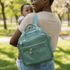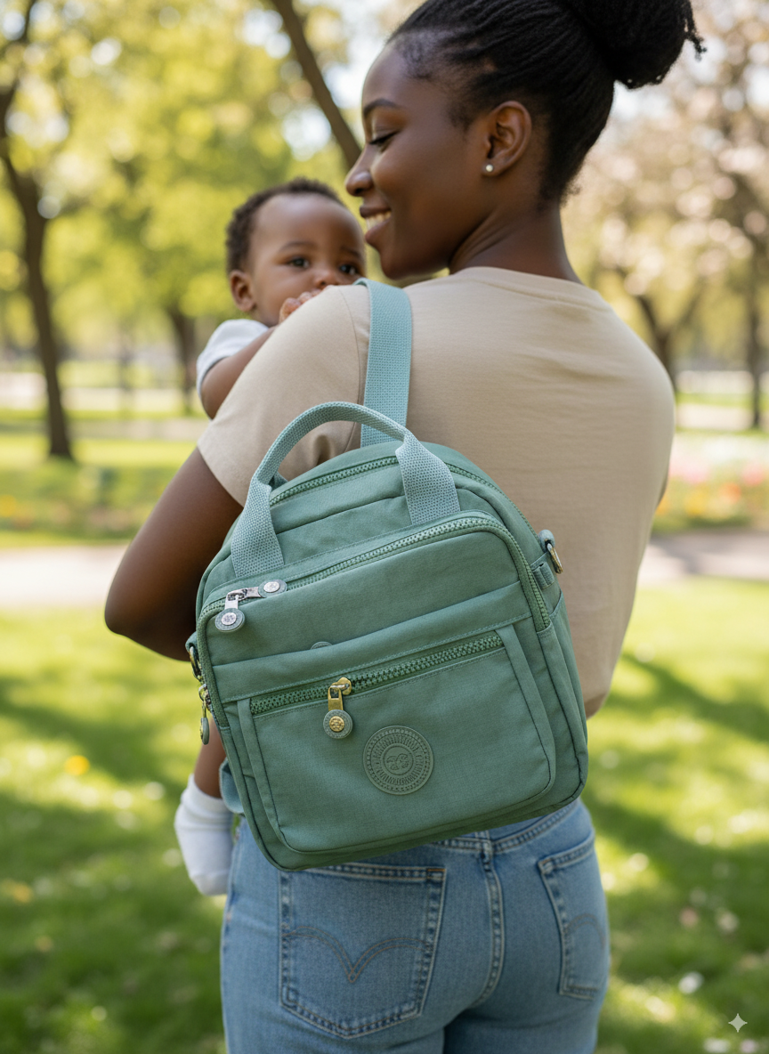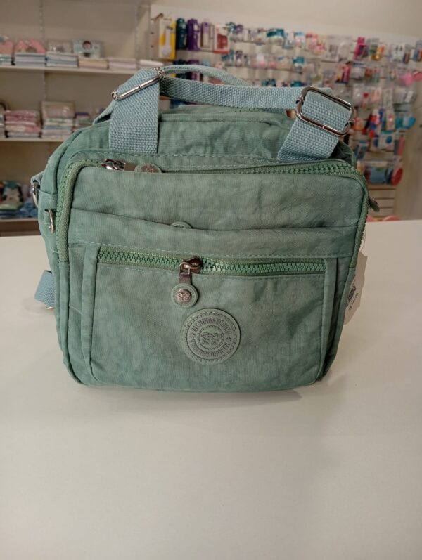 Mochila pequena, podendo ser usada como bolsa transversal, com bolsos esternos e internos com varias divisões