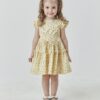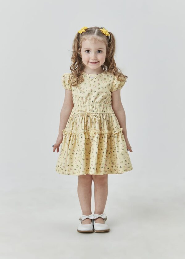 Vestido amarelo estampado com pequenas flores, rodado, com elástico na cintura. Super delicado, em tricoline.