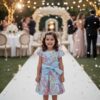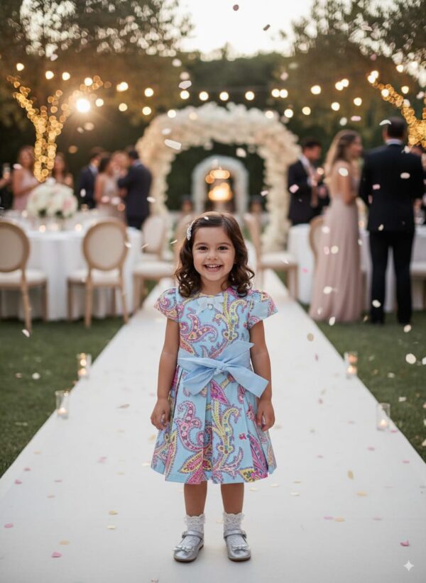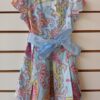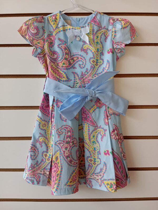 Vestido rodado com estampas alegres e laço, com zíper invisível tecido 100% algodão