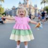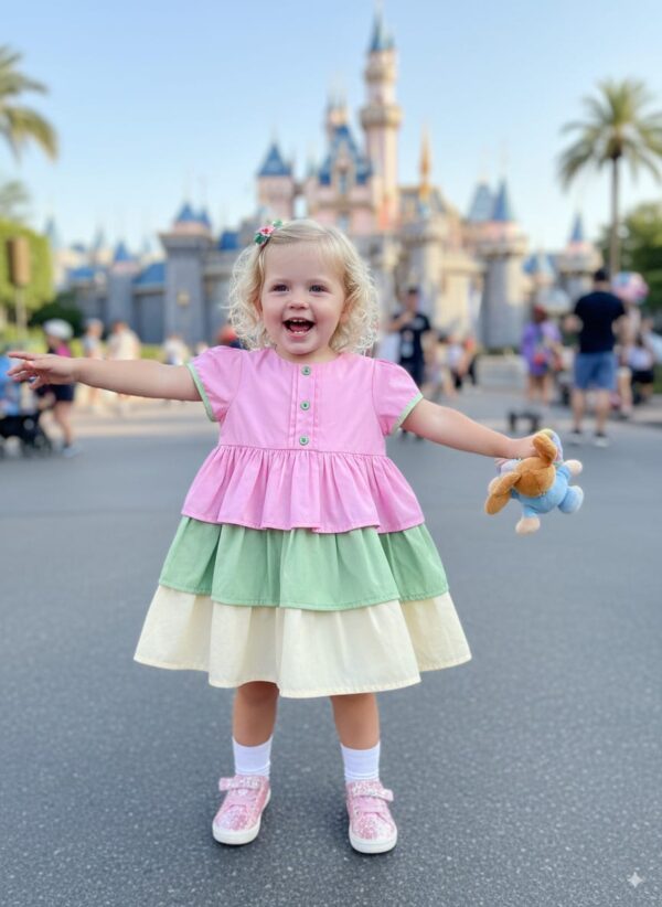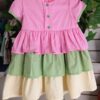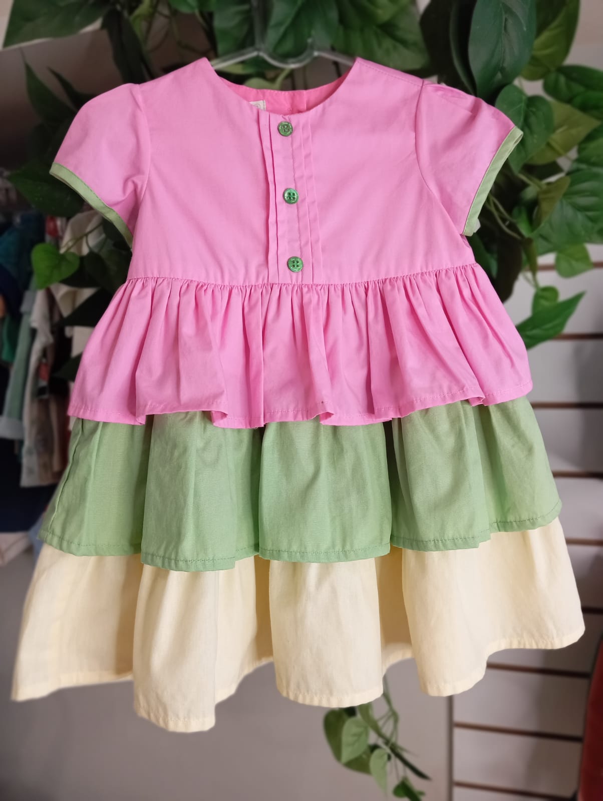 Vestido em mix de cores, com babados, abertura de botões nas costas